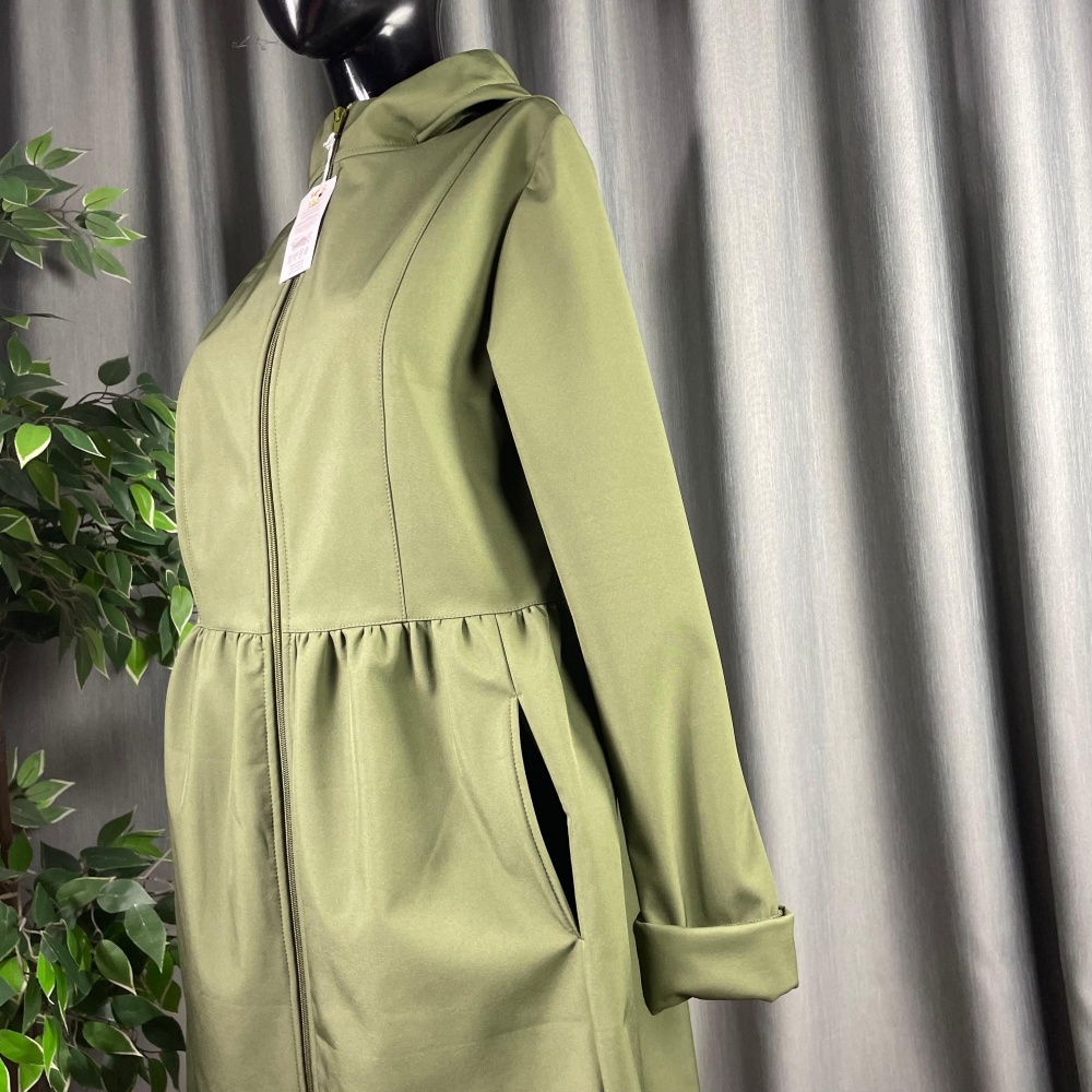 Mētelītim griezums vidusdaļā, kuplāka lejasdaļa, kapucis un atlokāmas piedurknes (var regulēt garumu)